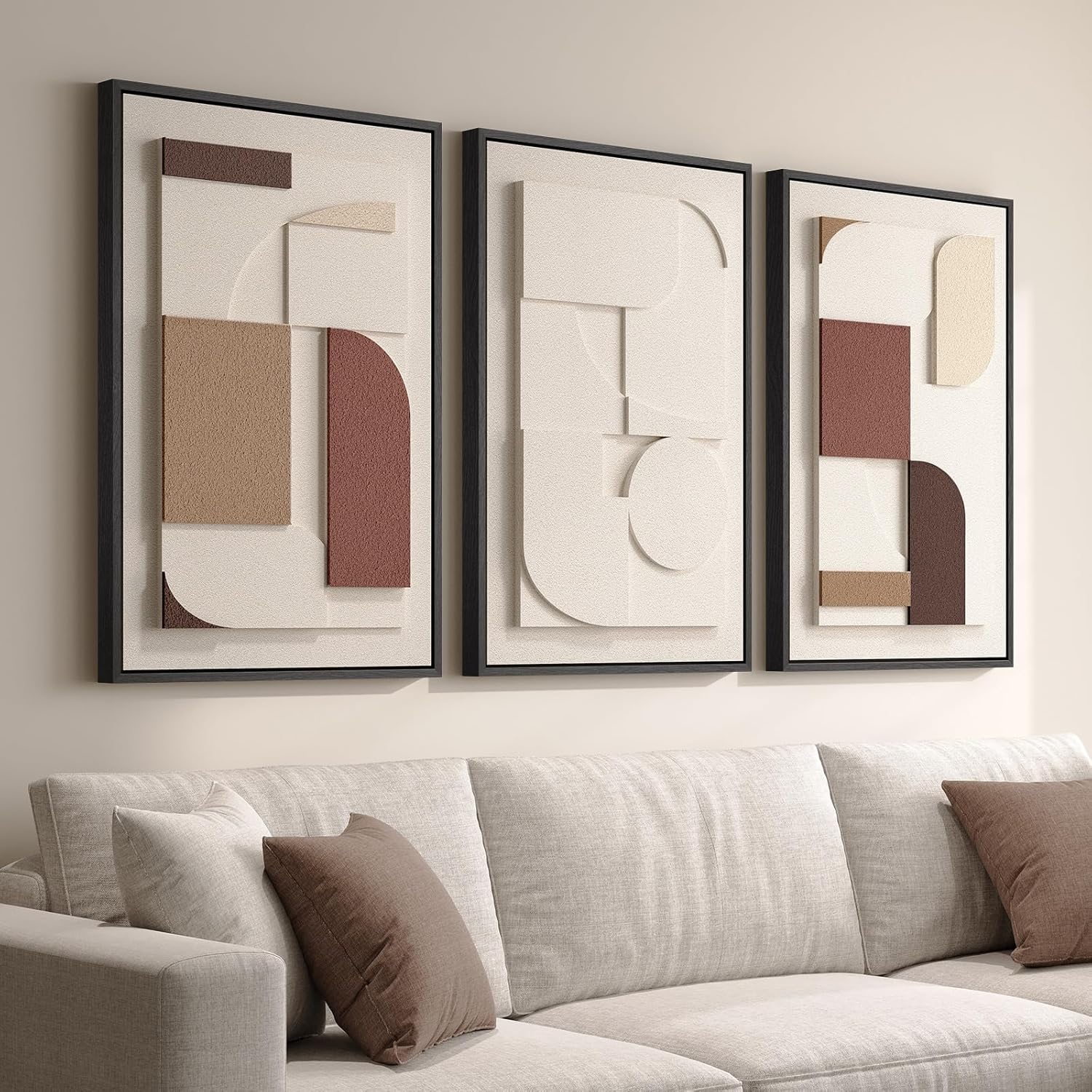Framed 3D Textured Wall Art: Modern Abstract Geometric Artwork, a set of three large framed 3D textured wall art pieces, each measuring 16x24 inches, with a total size of 24”H x 48”W. These paintings are airbrushed with sandstone pigments onto multi-layered, moisture-resistant wood backing boards, creating not only a 3D appearance but also a true 3D textured feel! The outer frame is made of sturdy material for durability. High-quality decorative paintings you deserve to have.
