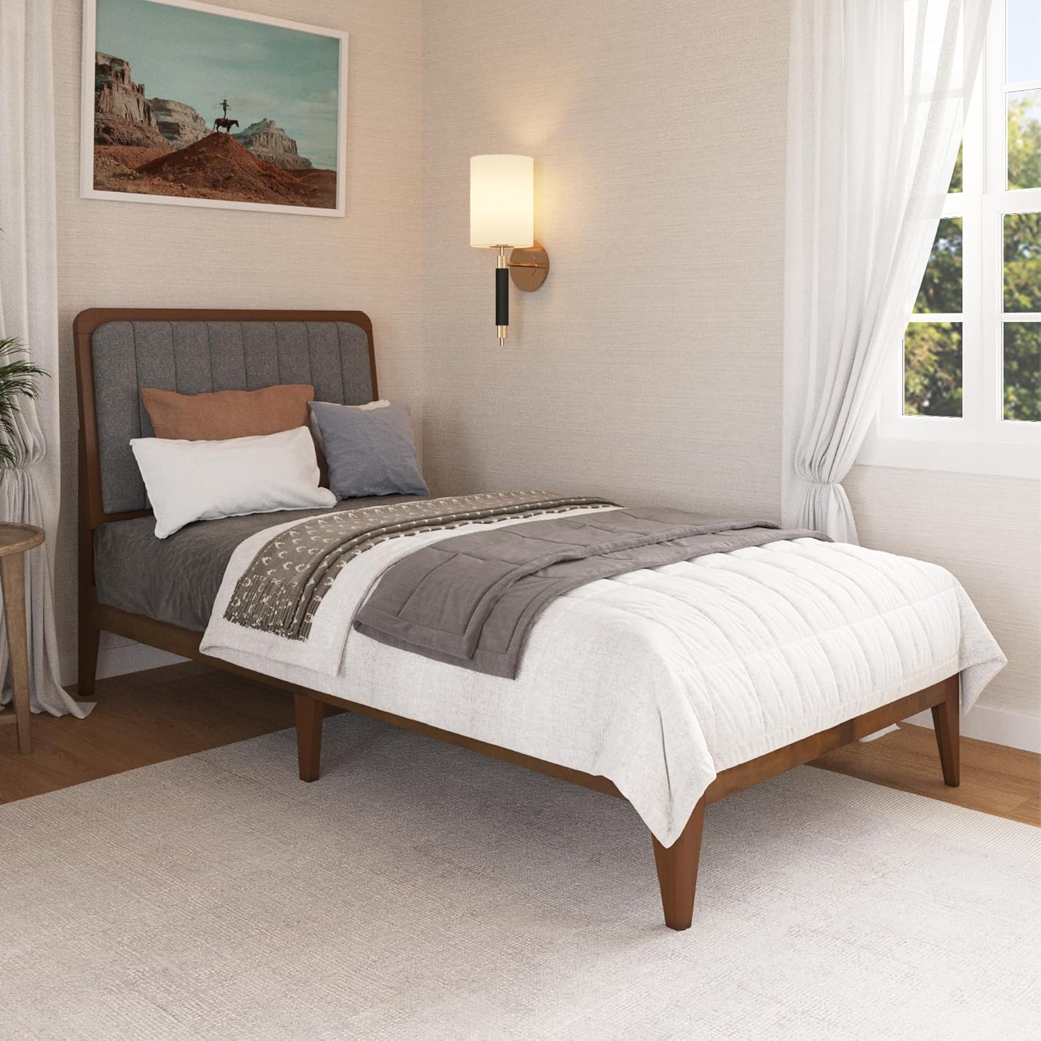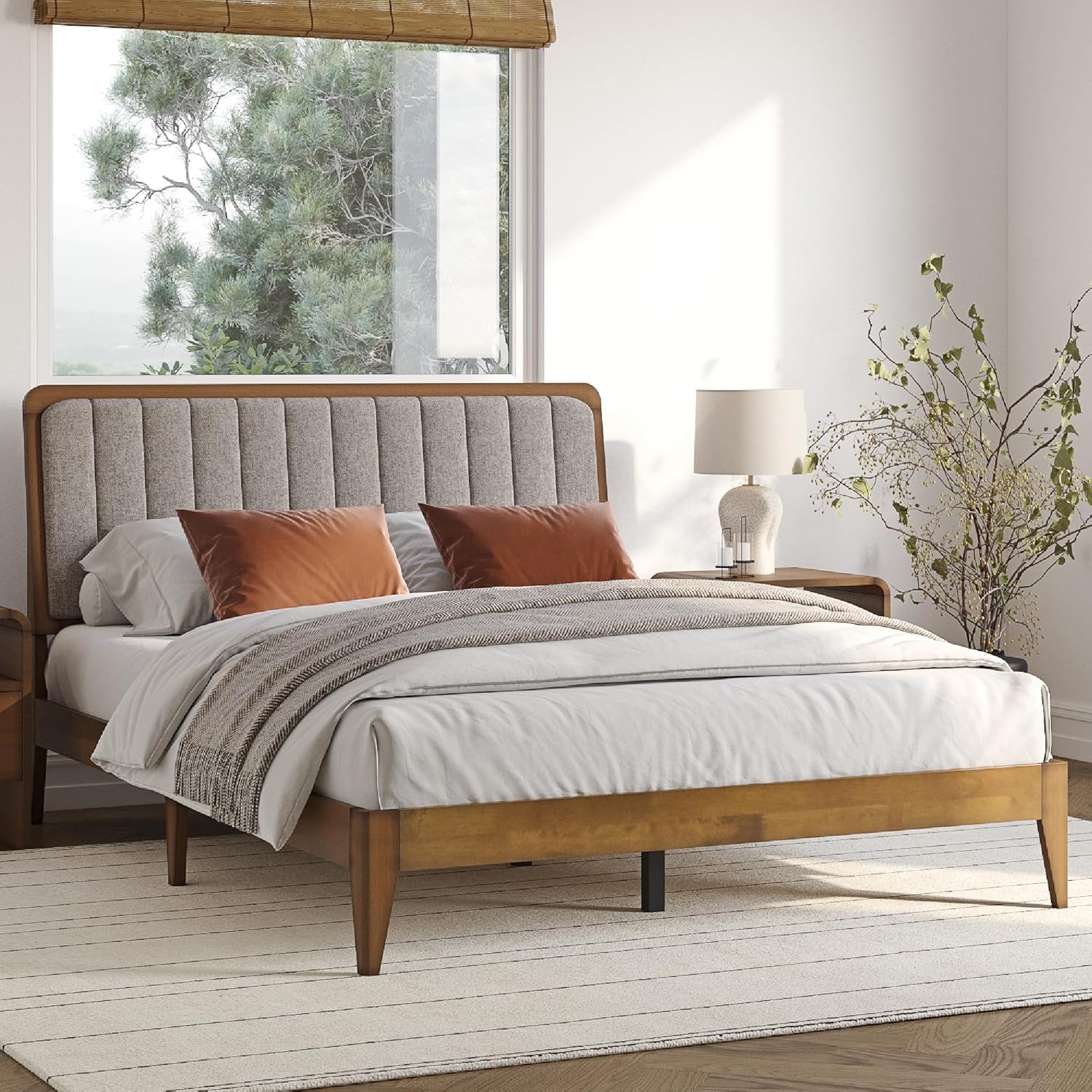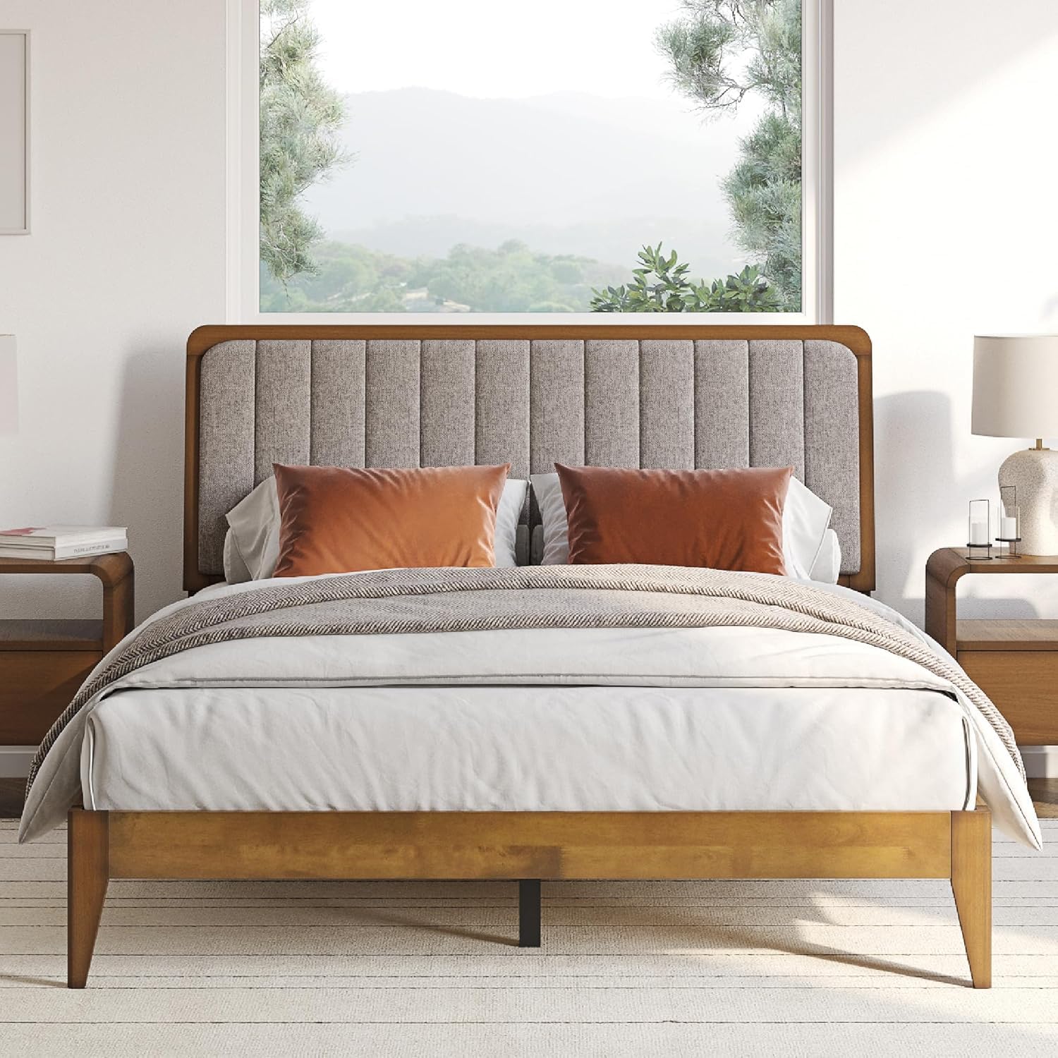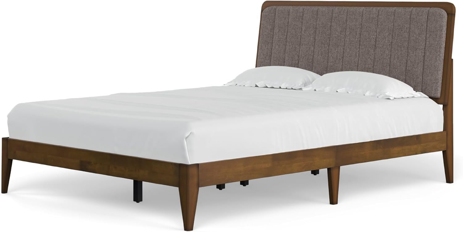 MID-CENTURY STYLE: Get a sleek and sophisticated vibe with DG Casa Queen Bed Frame in Walnut. With vertical channel tufting in neutral brown upholstery and a brown walnut wood platform bed frame, this upholstered platform bed is a stunner.