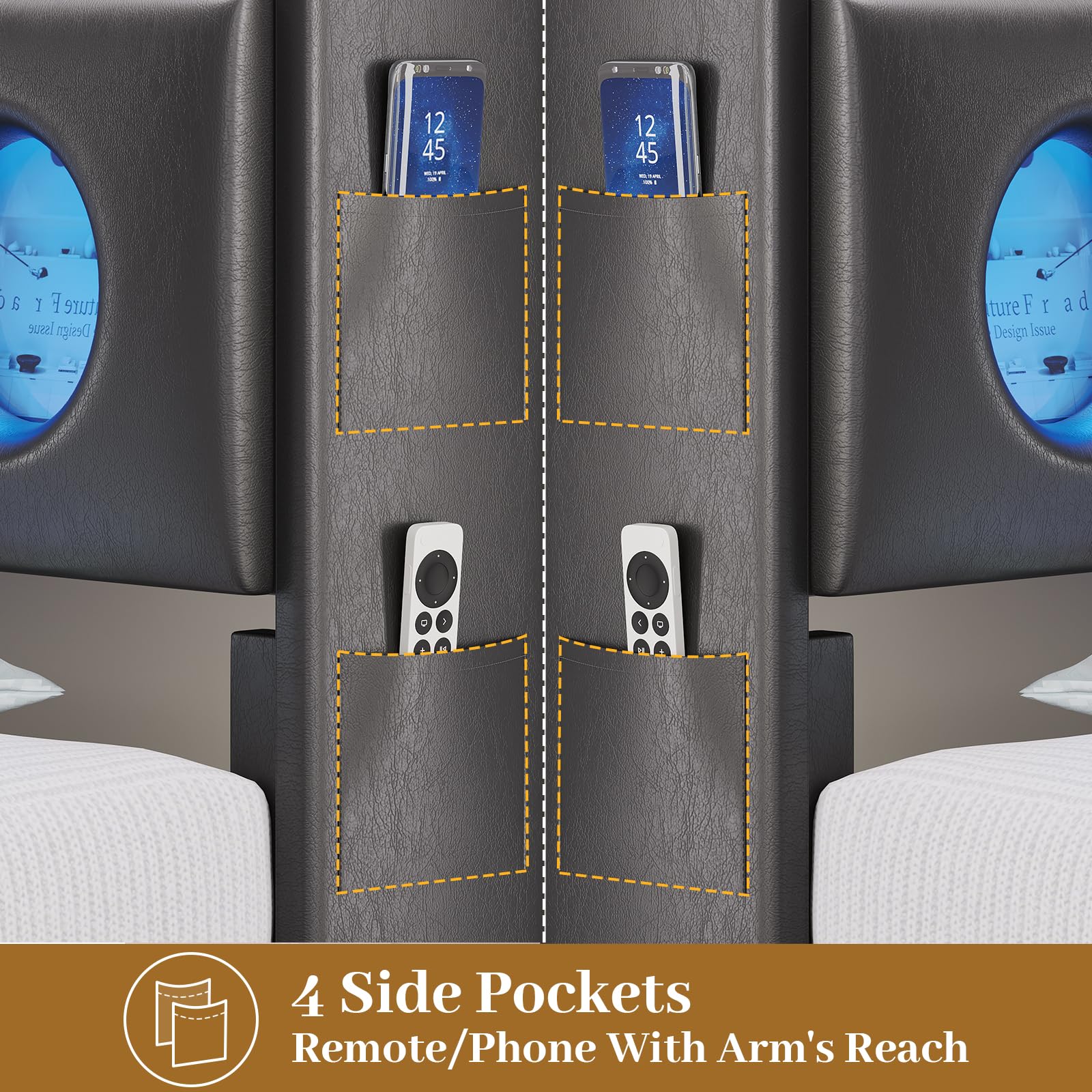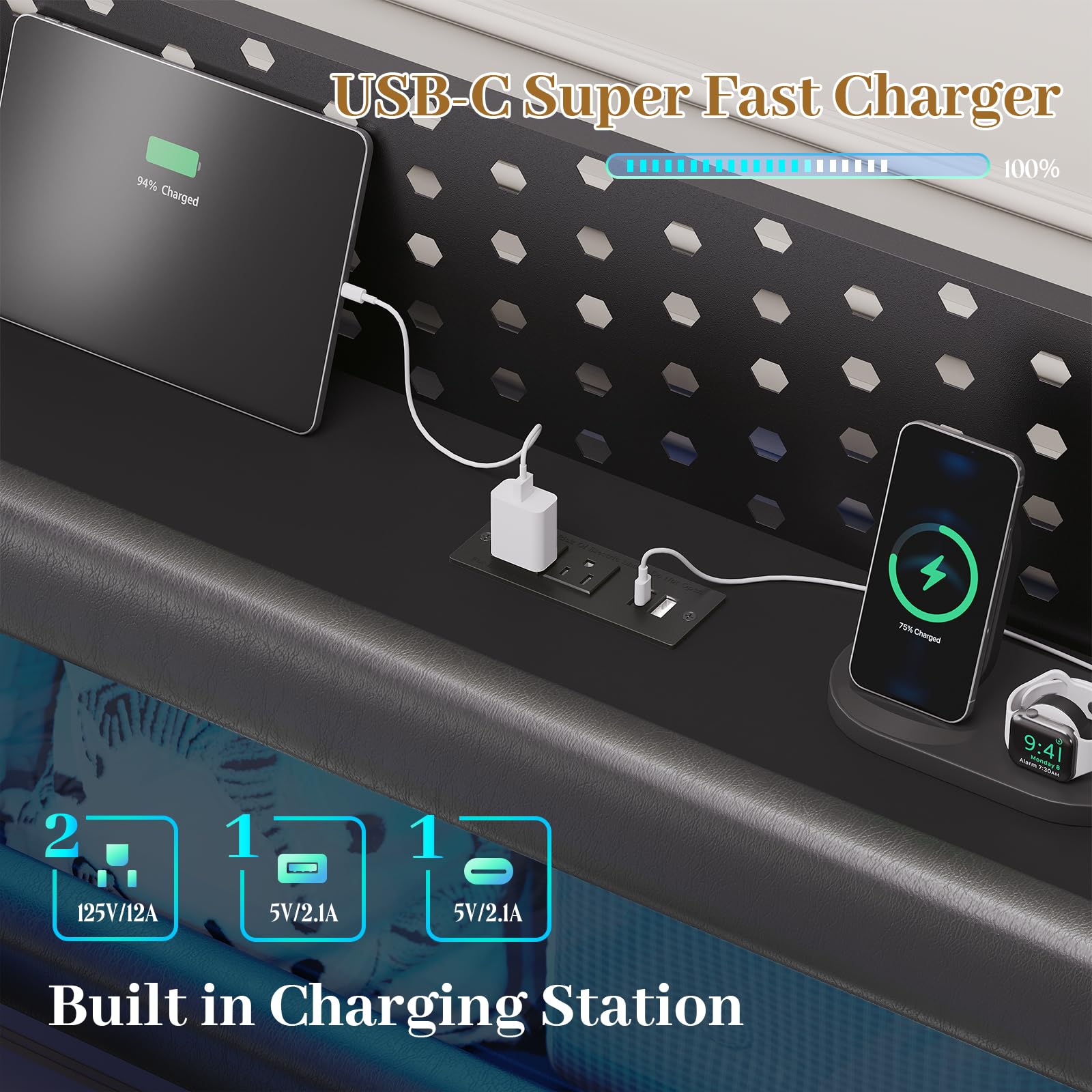 Floating Bed with Charging Station: Queen floating bed frame with storage headboard has a built-in power strip on the storage headboard, which has 2 AC outlets, 1 USB port and 1 Type-C port. When you're resting in bed, it's very convenient to charge all your electronic devices, such as mobile phones, tablets and headphones, so that they can be fully charged