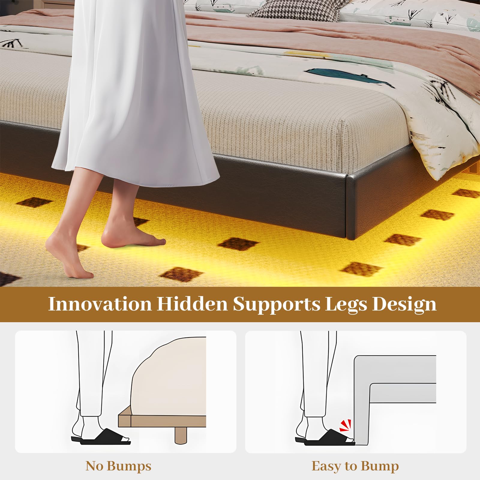Floating Queen Bed Frame with LED Lights: Floating LED bed frame queen with two side hidden light strips under the bed. The metal platform bed with beautiful multi-color RGB LED light strip (over 60000 colors), controlled by remote control/APP, and you can easily set the brightness, color, mode, and timing function according to your mood. Turn on the lights, and the bedroom will be filled with different atmospheres such as romantic, warm, and stylish