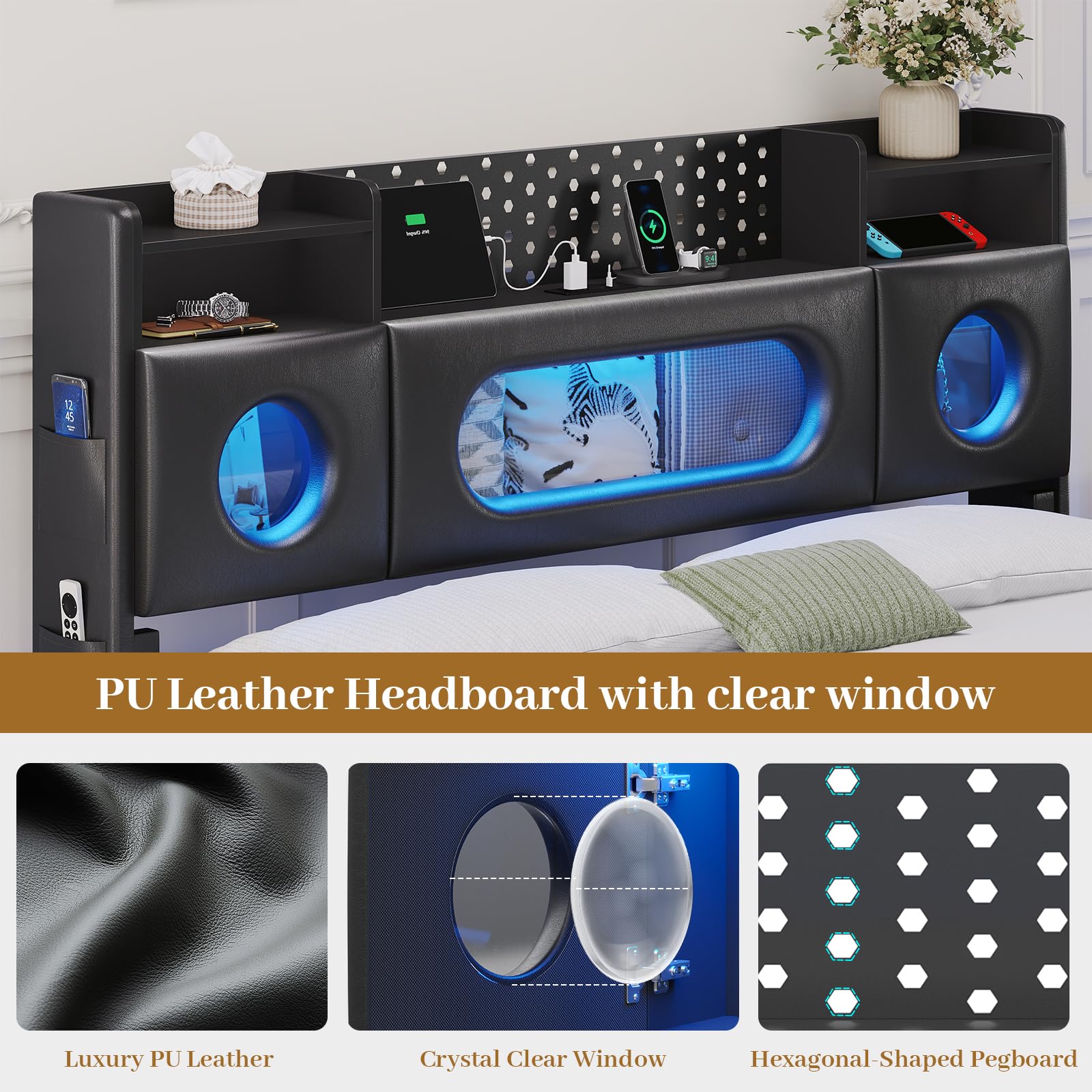Cool Floating Bed Frame Queen Size: Our unique floating queen size bed frame support system carefully hides the legs inside the bed frame. When you lie on the bed, the blue LED lights under the bed outline smooth lines along the bedside, which creates a feeling of floating lightly above the water, and through the special transparent window at the head of the bed, it is as if you have entered the underwater world, creating a stylish, high-tech atmosphere for your bedroom