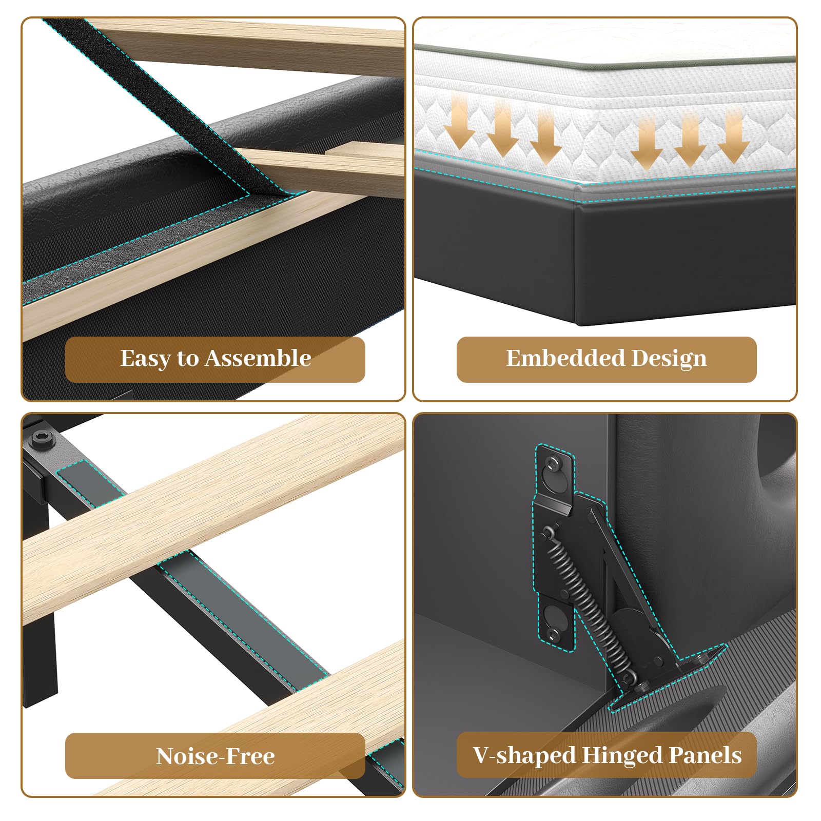 Sturdy Construction & No-Noise Design: Upholstered leather platform bed features sturdy metal construction with a strong wood slat support system. The floating platform bed frame queen size is supported by 12 straight wood slats, 3 thickened metal slats, and 9 support legs that hold the bed securely without wobbling at all. It can hold up to 880 pounds. The metal beams have EVA foam sound-quieting strips to help you sleep quietly through the night