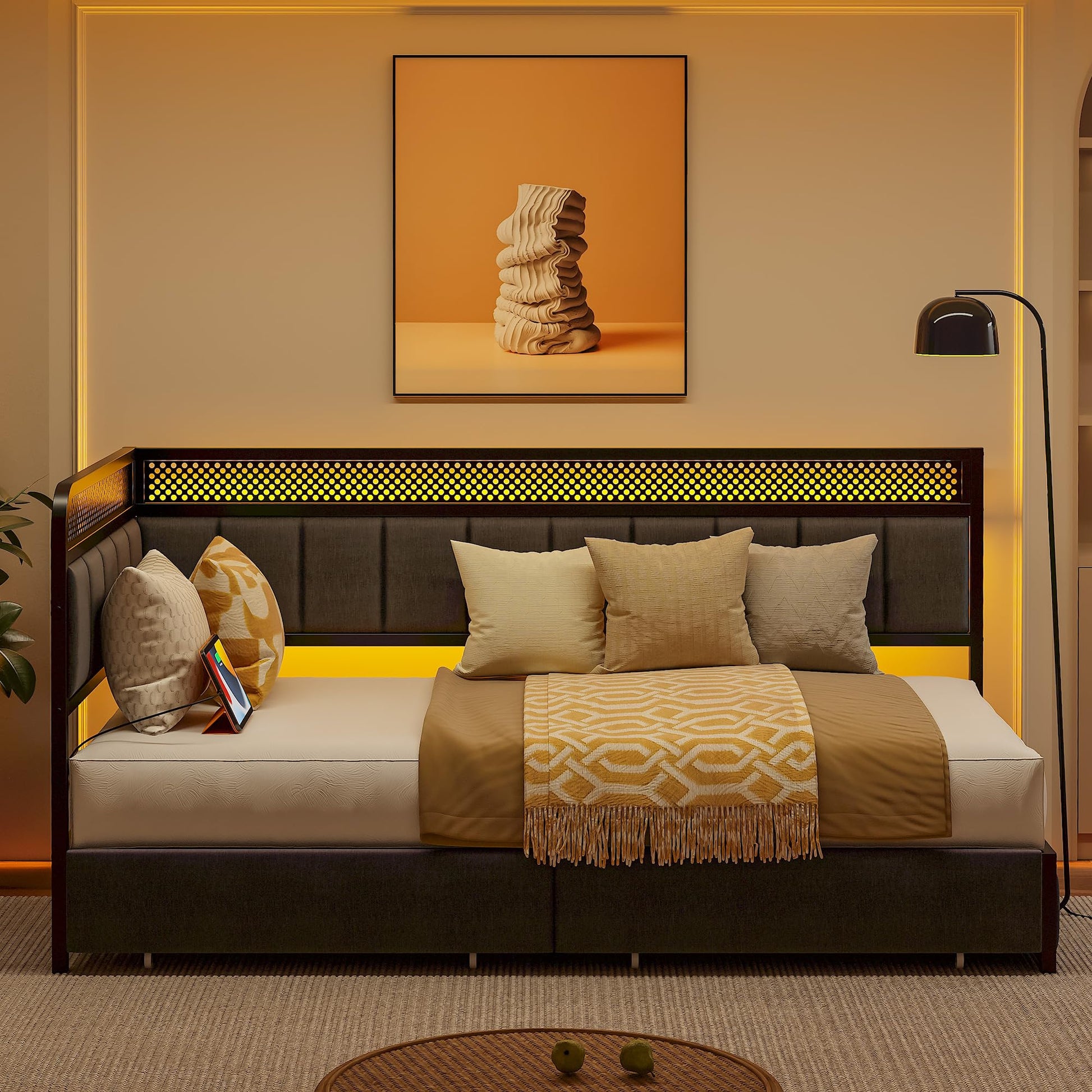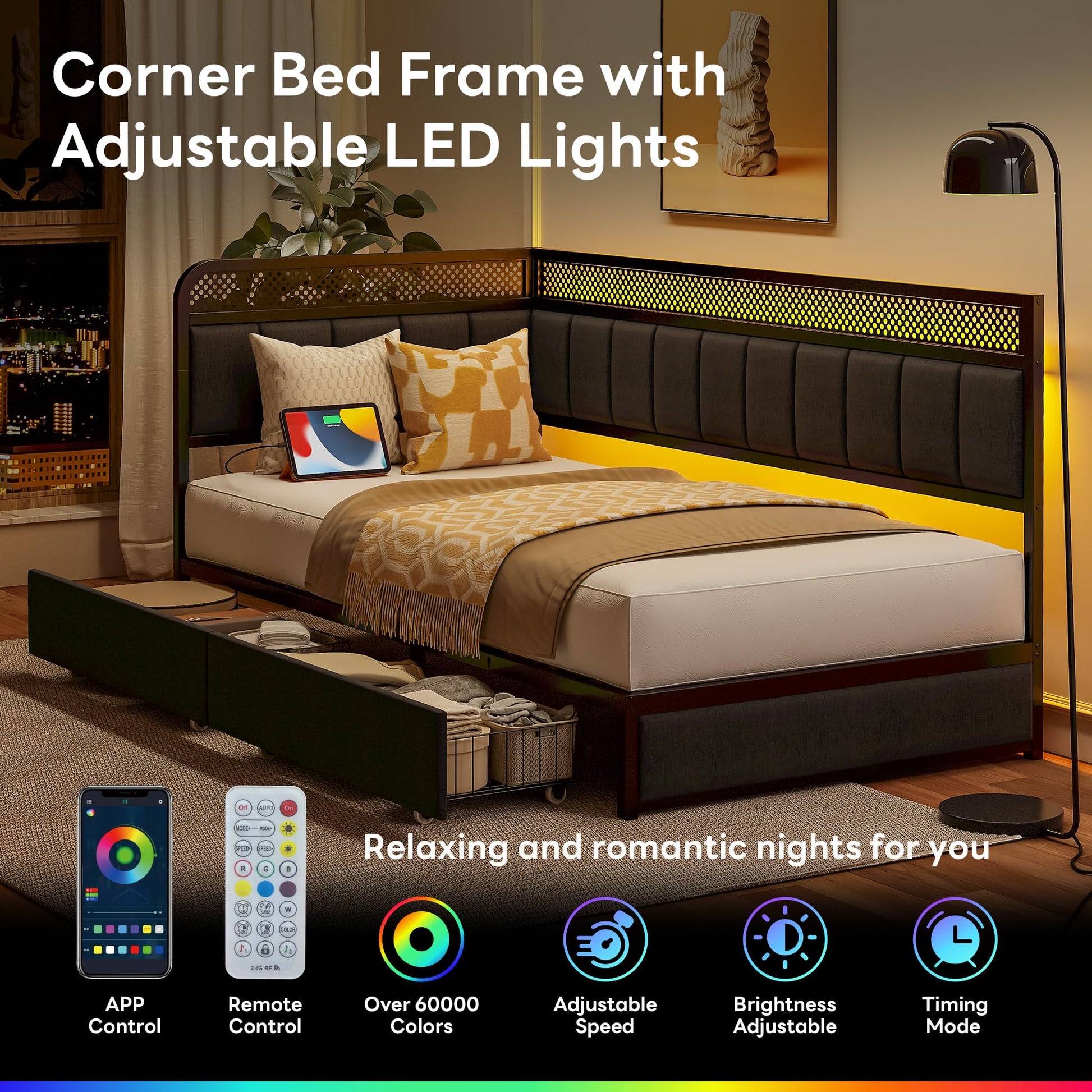 Convenient Charging Station and LED Light: This corner bed equipped with hidden removable power sockets (2 USB + 2 AC), you can charge without getting up. The hidden design avoids the clutter of cables and improves the beauty and neatness of the space. The dimmable LED light strip can be freely adjusted to create a personalized space atmosphere.