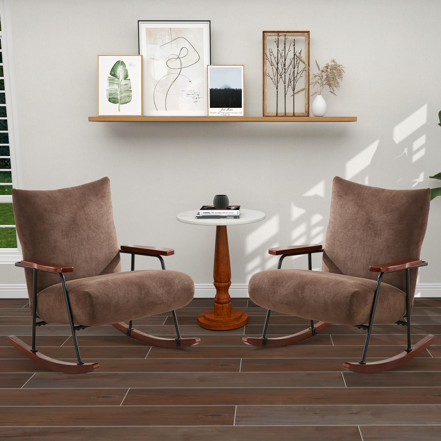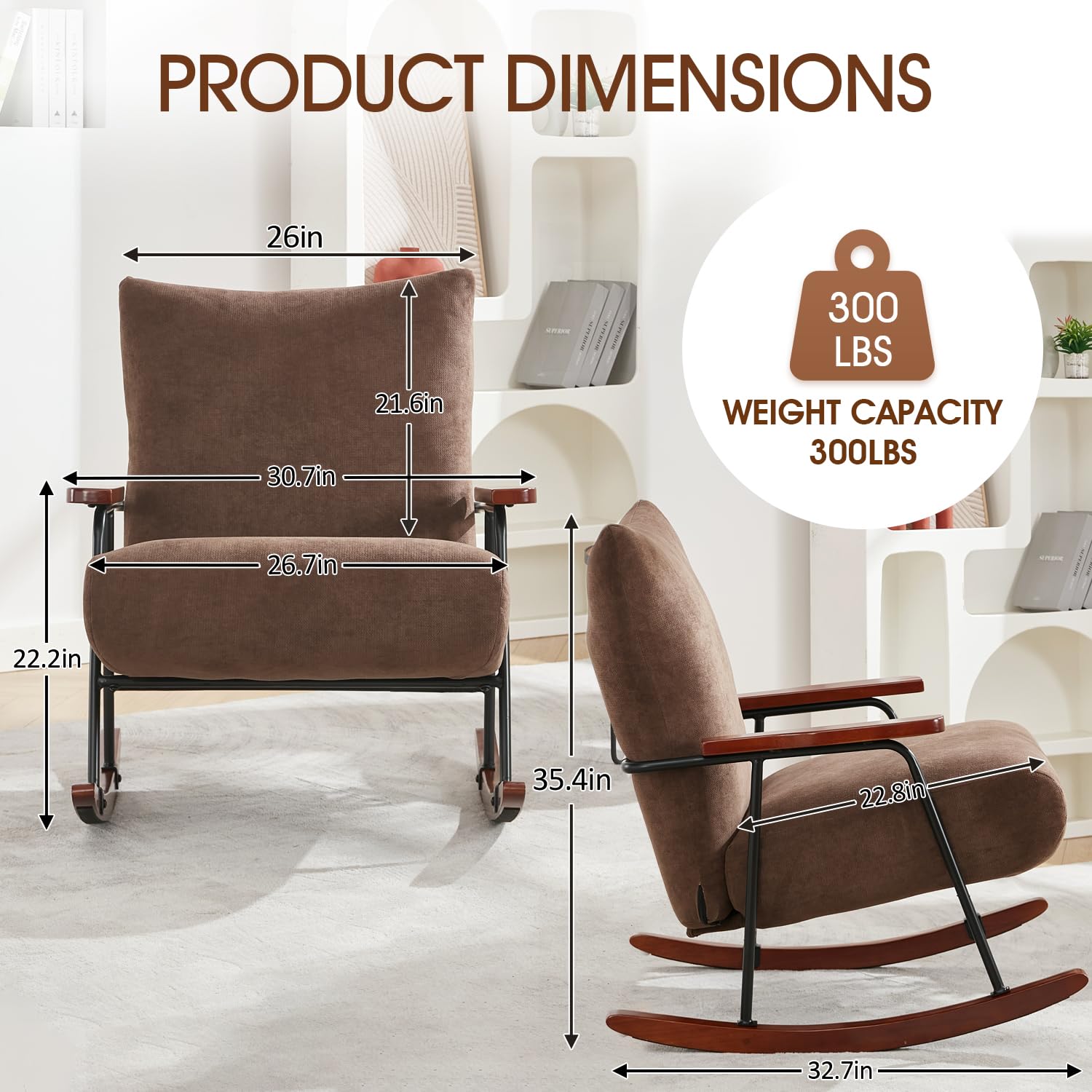 STURDY FRAME: Our rocking chair features a sturdy metal frame and solid wood rockers, along with solid wood armrests, ensuring the chair's exceptional durability. The chair has a maximum weight capacity of 300Ibs.