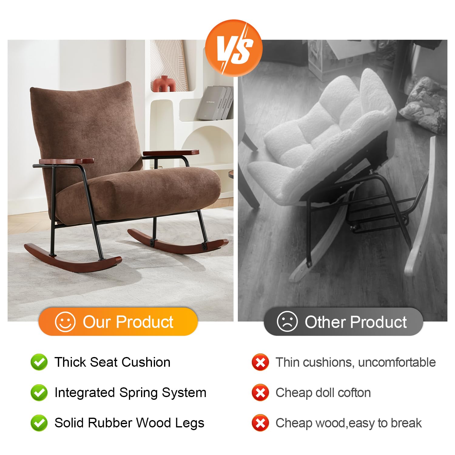 STABLE ROCKING: The anti-tip stopper on the solid wood legs can prevent you from tipping backward. The soft pads on the bottom can prevent the rocking chair from slipping, protect your floor, and reduce noise.