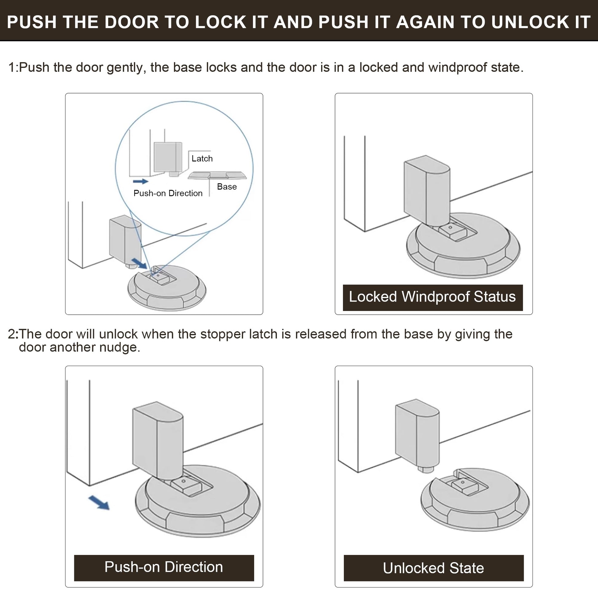 - DESIGN: Adopt double no-hole design, strong adhesive fixed door stopper, gently push inwards, the windproof door stop can be fixed to the door, it can also be fixed with screws