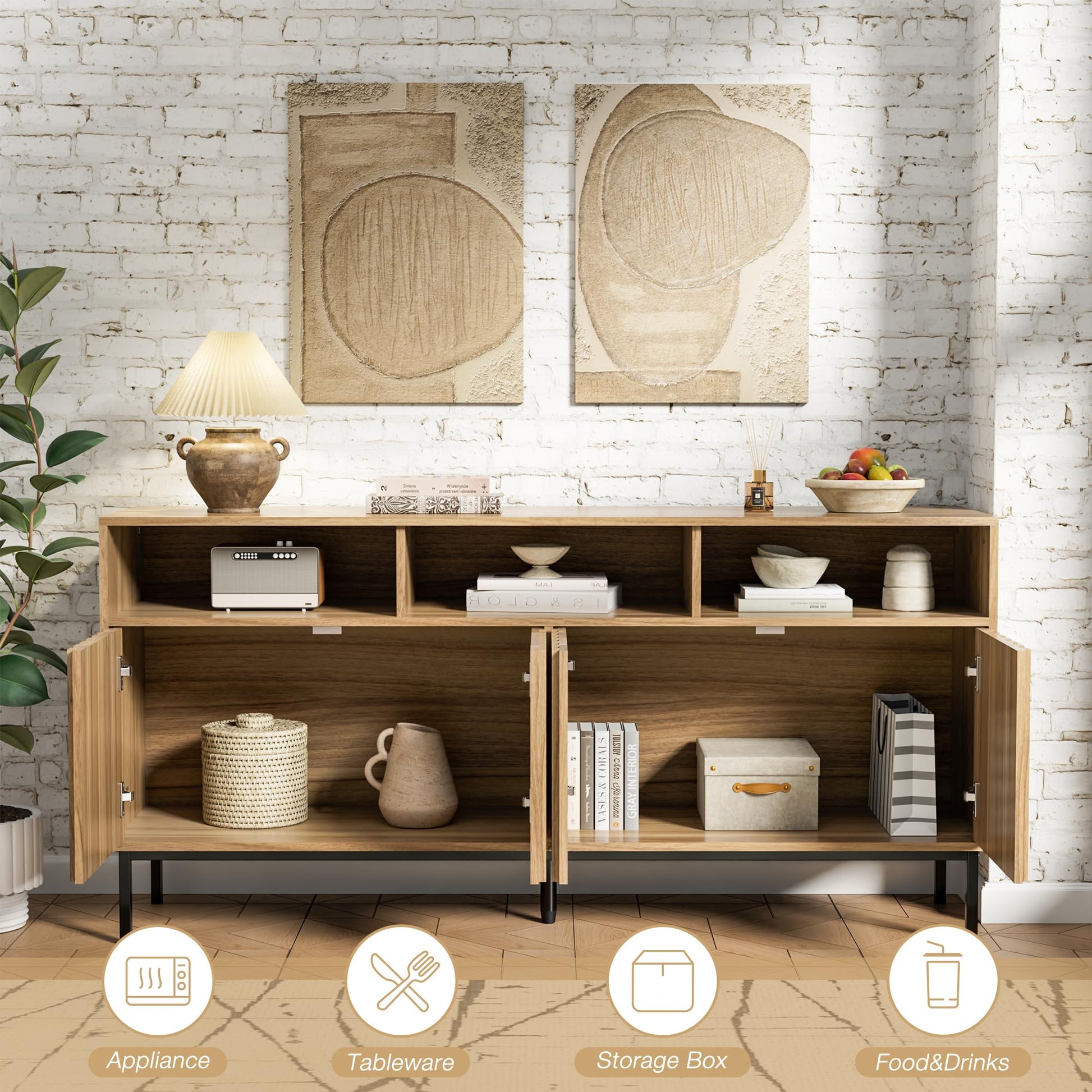 - Wood Buffet Cabinet: Natural wood color modern buffet has 4 doors,2 large spacious room inside and 3 shelf storage which provide you multi-storing choice.