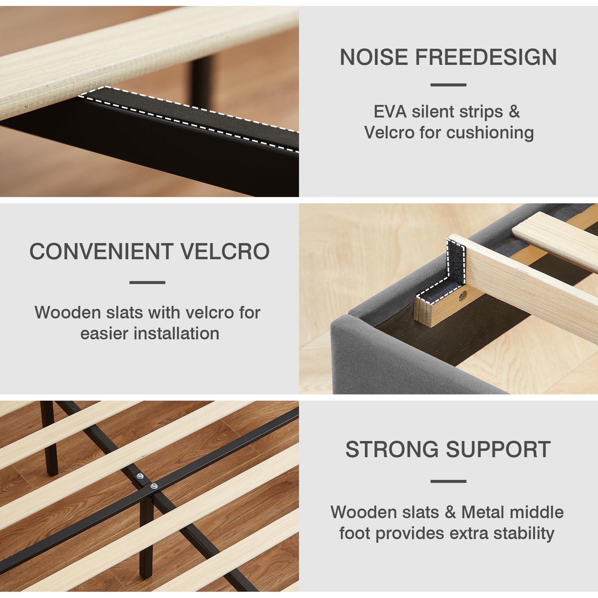 LED-Lit: Upgrade your bedroom with our stylish grey led bed frame. Enjoy customizable LED lights with 7 colors, adjustable brightness, and various modes controlled via switch, remote or smartphone app. Set the perfect mood for any occasion.