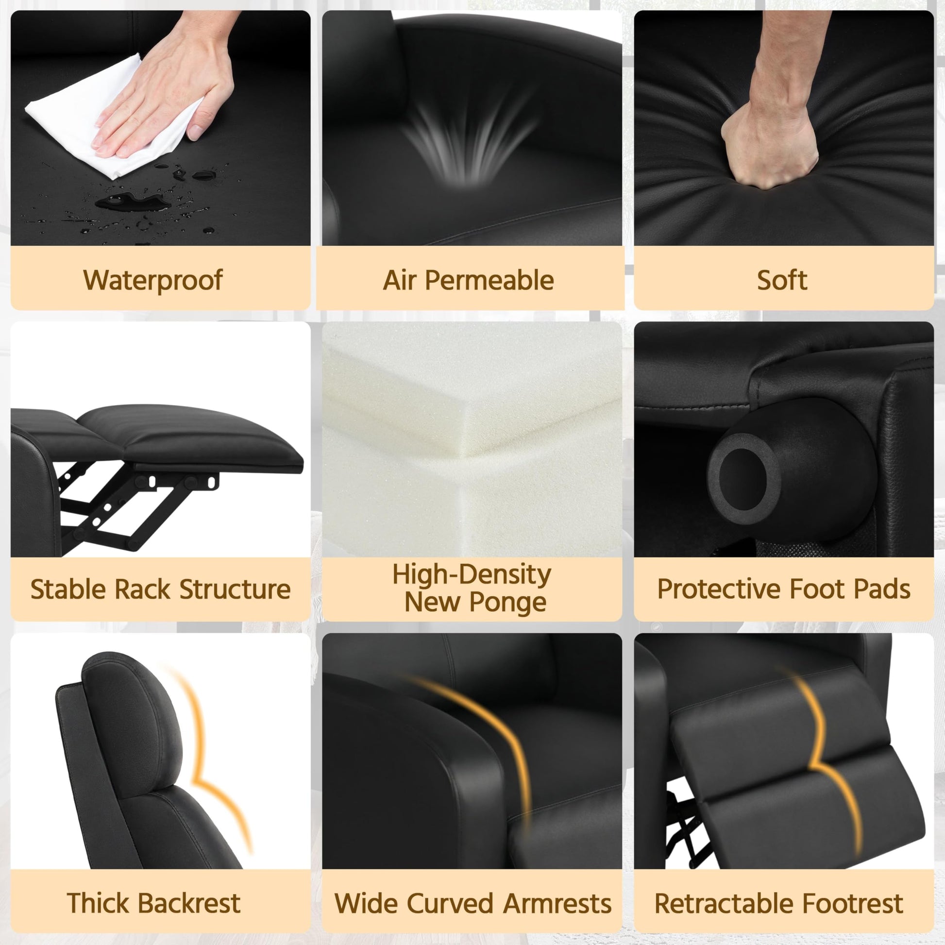 Marshmallow-like Softness: The upholstered recliner chair features a soft-cushioned seat supported by a pocket spring, and extra-thick foam and rayon fibers filled the backrest and extensible footrest of the recliner chair. The excellent elasticity and soft touch of the faux leather upholstery give you the ultimate comfort